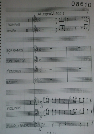 Manuscrito do final do século XVIII, em cópia do Padre José Joaquim de Souza Lira. Esta foi a primeira obra de Manoel Dias de Oliveira a ser partiturada e apresentada em concerto, a partir de trabalho realizado por Aluízio José Viegas.